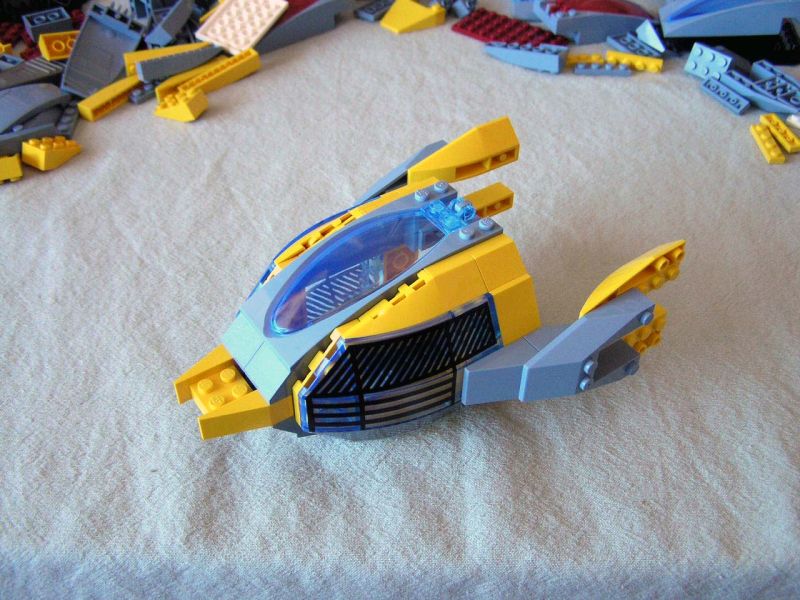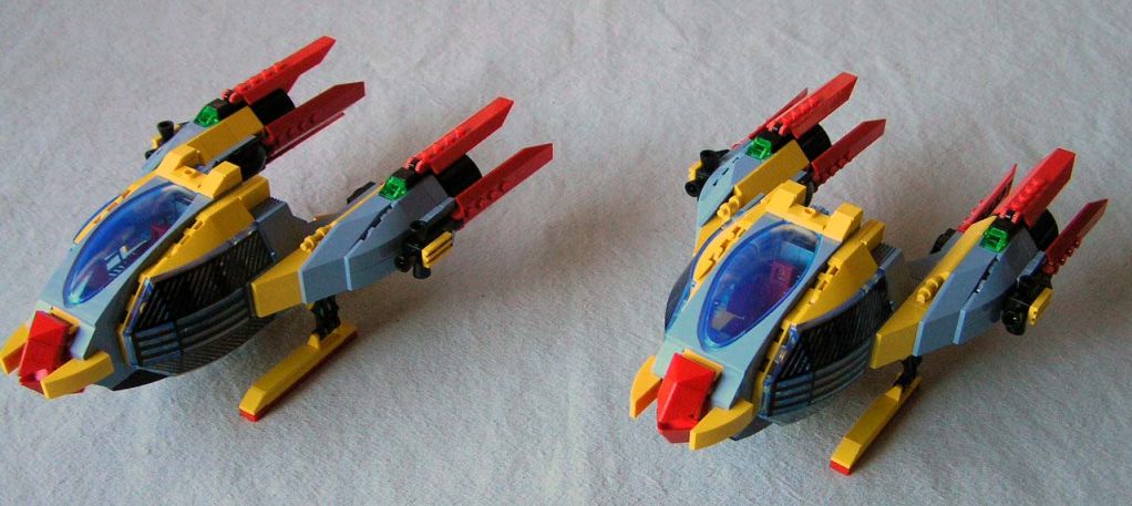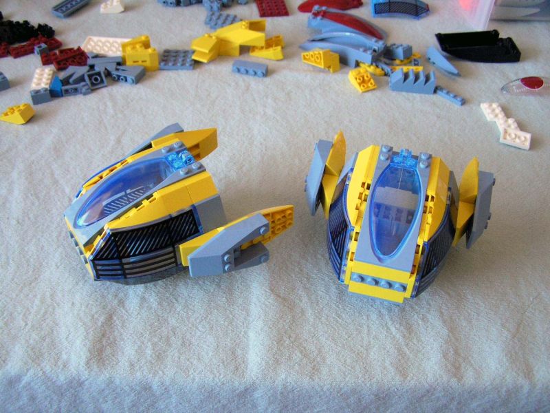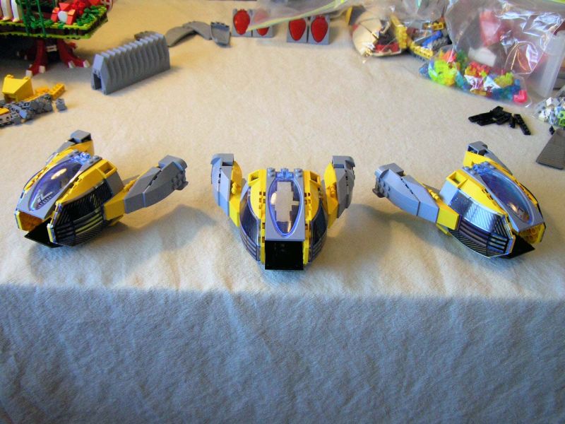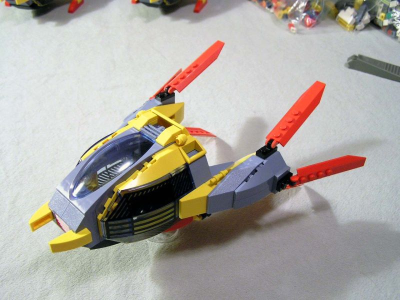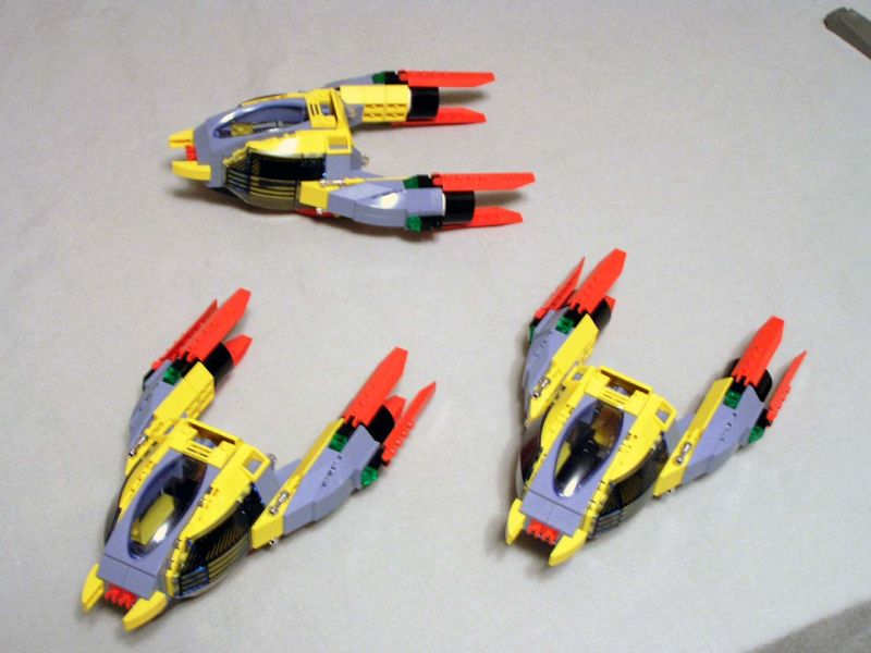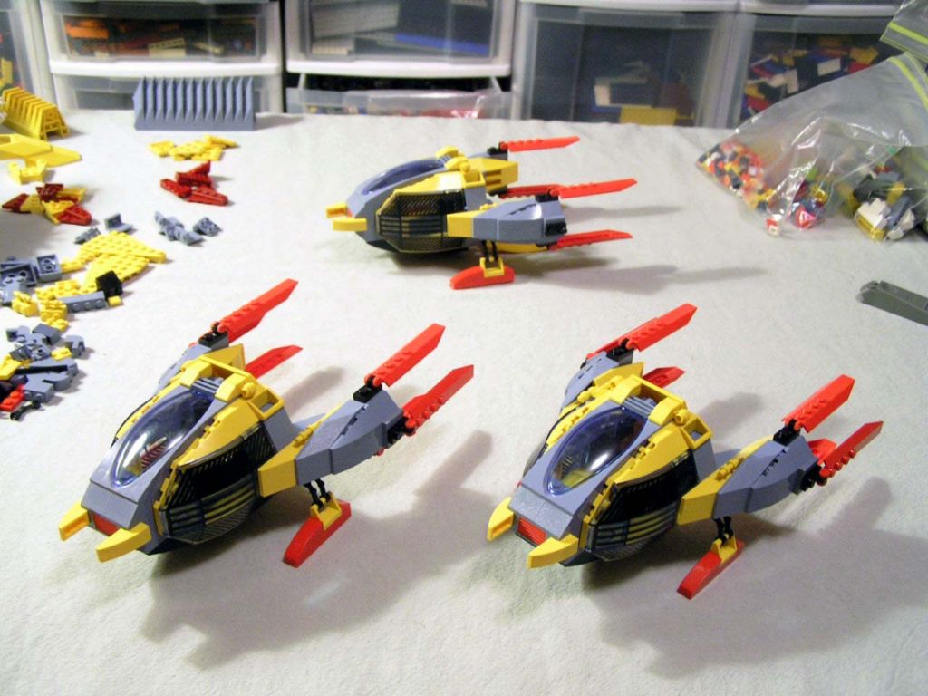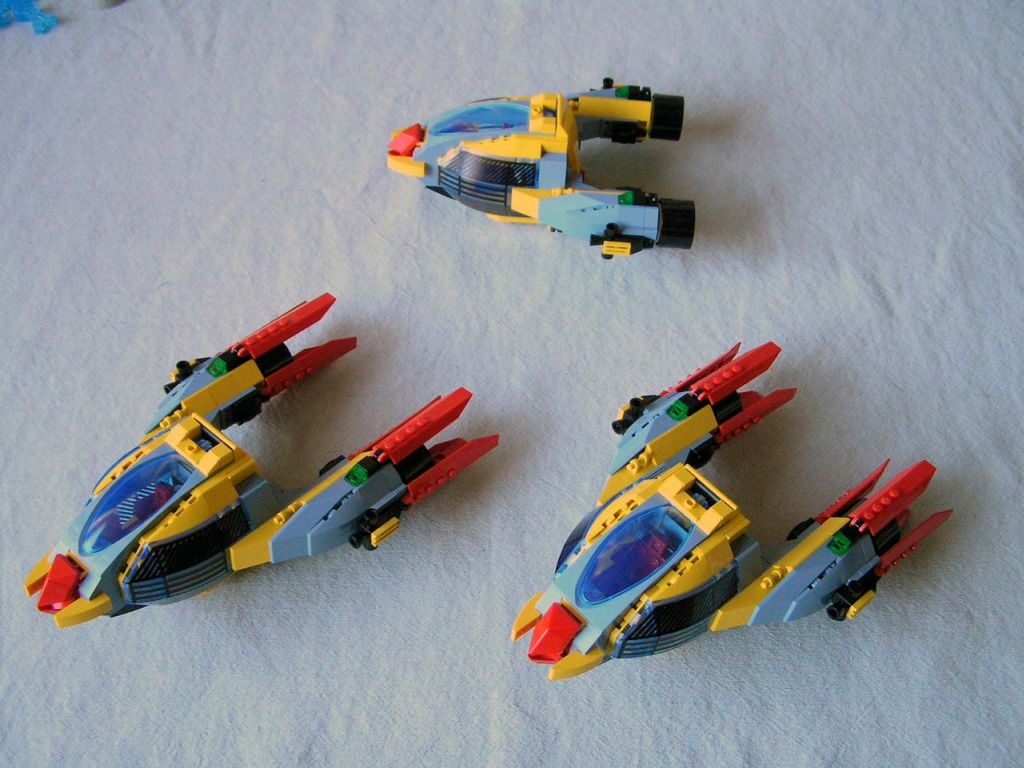 It all started with SNOT *. Well, not just SNOT, but also a desire to make at least three identical craft. I'd wanted to build a pair or wing or squad of fighters instead of just one ship, especially (like so many of us AFOL's!) because of my love of modern jet fighters. I've also been warming up to the recent trans-neon light blue color. With the addition of several of the new cockpit pieces used as radar from this Jack Stone set, I thought that I had an interesting shape to start with, which looked promising in combination with the new cockpit assembly from Alpha Team.