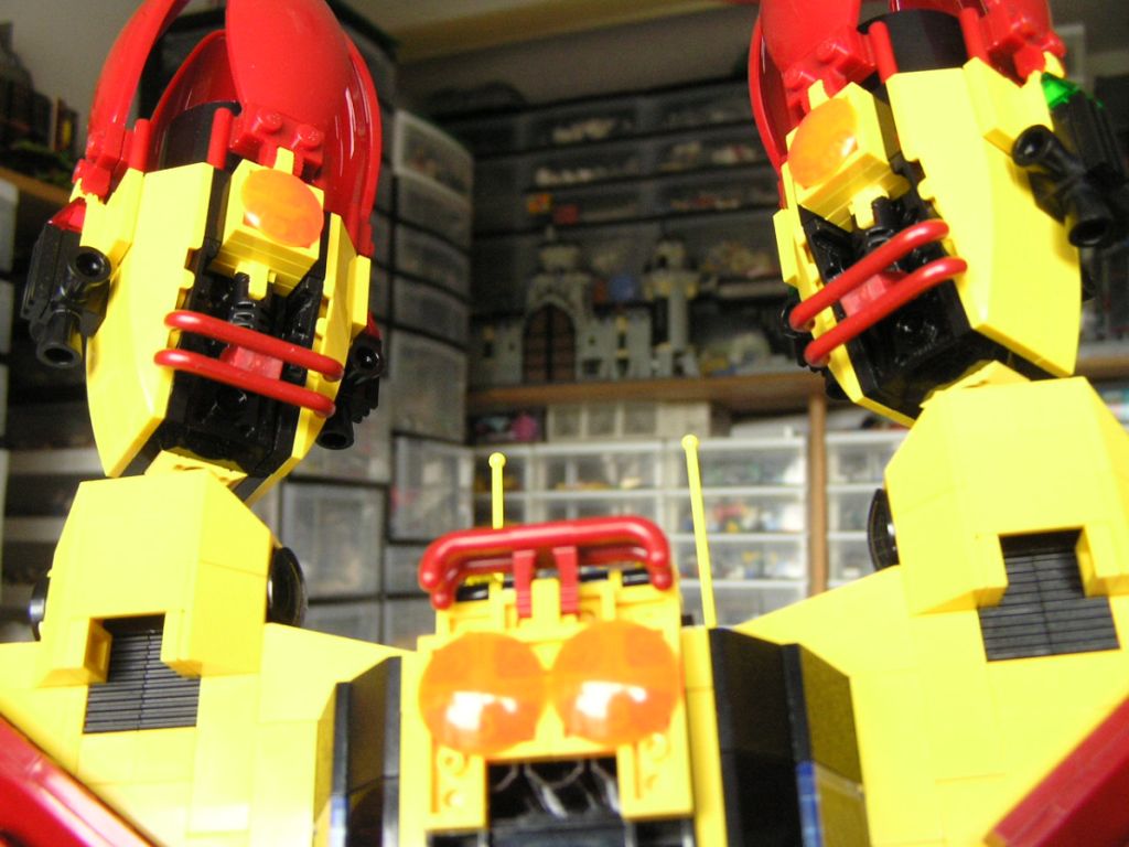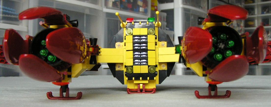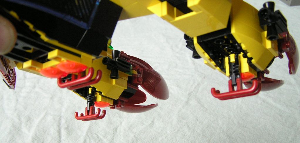 I added the click-socket joints behind the vents in the wings so that the engines could have a little mech action and greatly increased maneuverability. I think the next couple of action shots are good examples of what I had in mind.