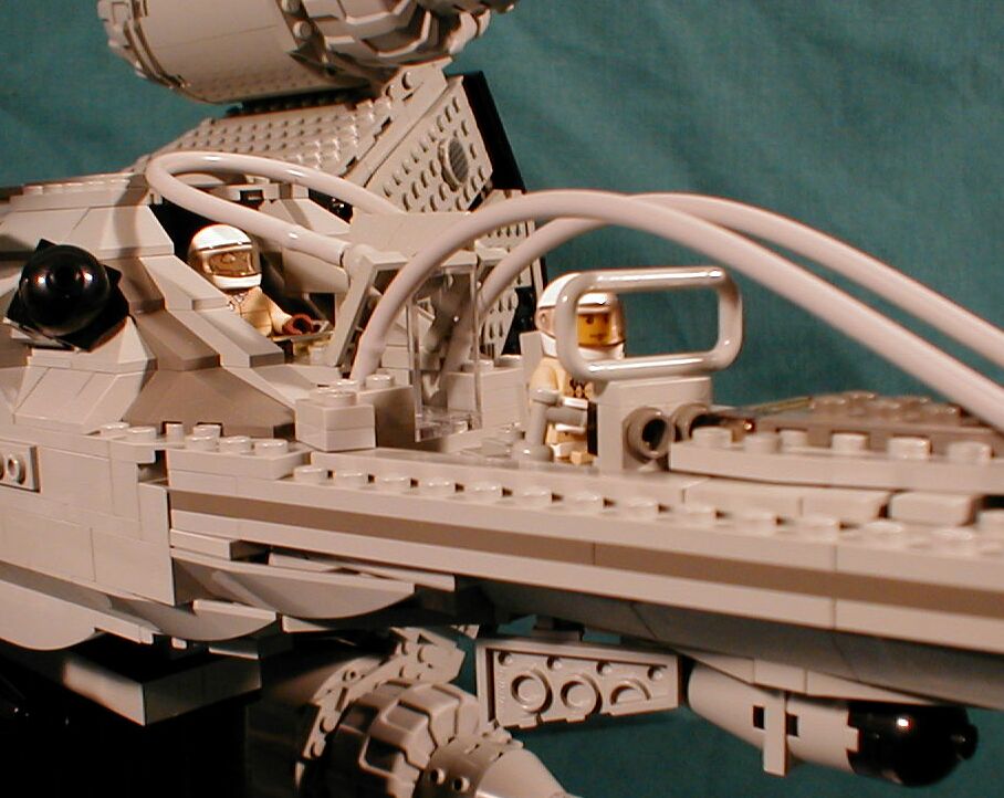 The cockpit went through six or seven versions before this one. I was totally jazzed when I seized upon the idea of using the pnuematic tubing for the cockpit lines. Pnuematic tubes fit snugly over the ball at the end of those little control sticks. Then, not only can they be snapped on like bricks at the ends, but the control stick gives you a wide range of positions.