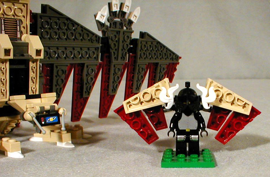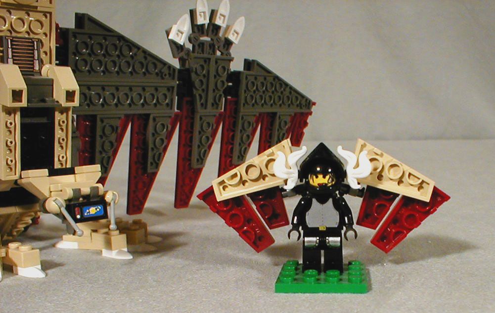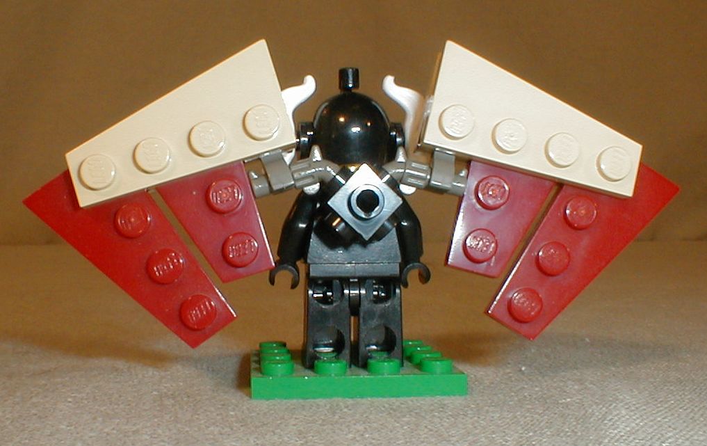 The wings are attached by two minifig six-shooters and a 1x1 brick with studs on all four sides. I messed around with this quite a bit to get a compact design but it's not very sturdy.
