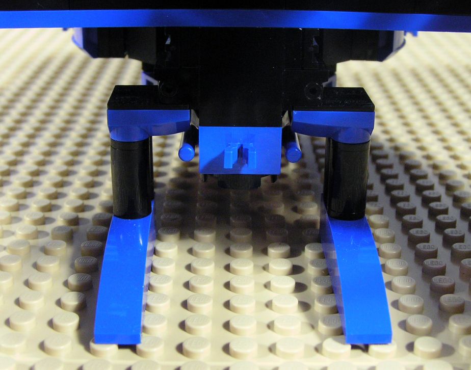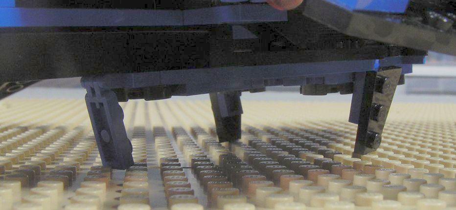 This design cried out for landing gear, so I was able to use a one-stud space between the expanded base to add a couple of simple pads. I also added engines to the underside of all the spaceships.