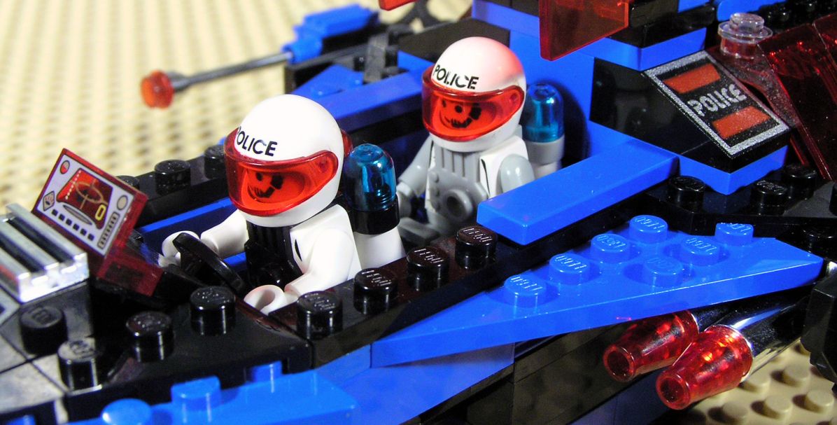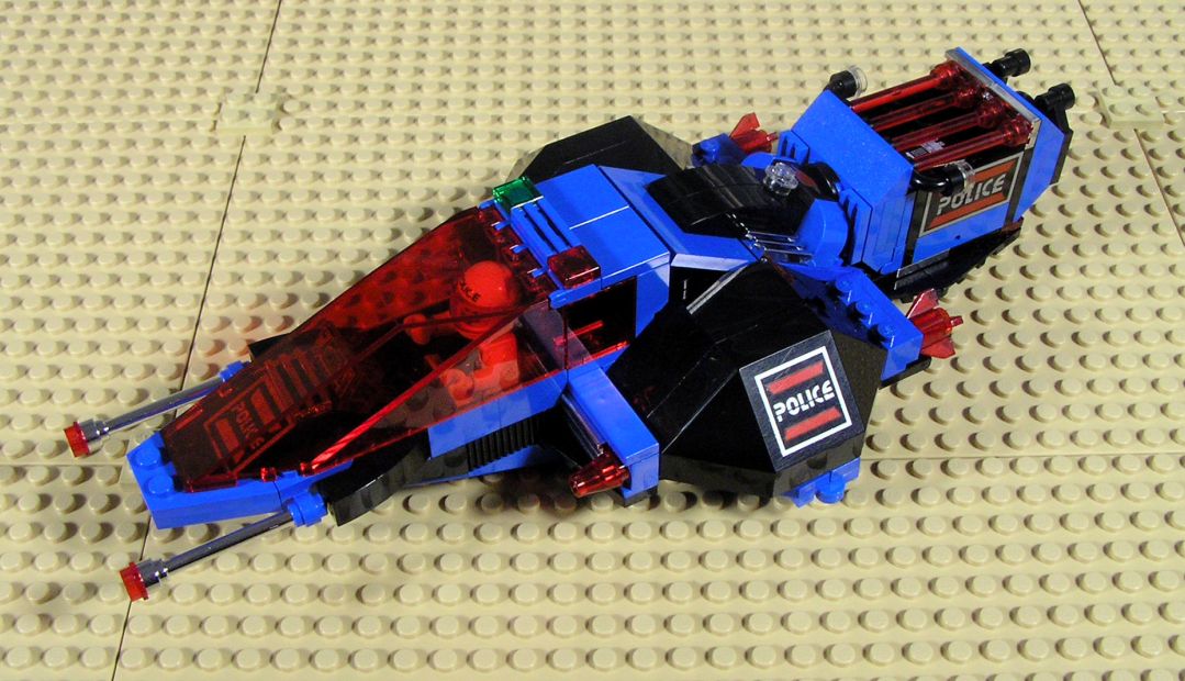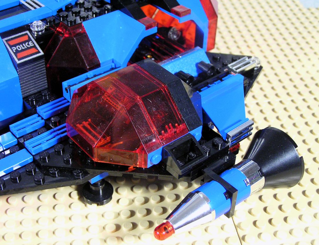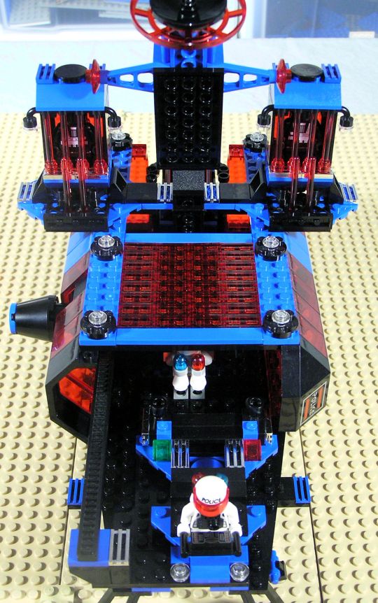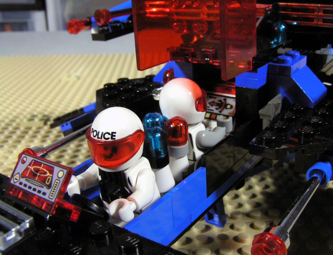 I have three of the trans-red canopy extenders, and vowed to use all of them. Here we have an officer at the steering controls while the lieutenant scans the surrounding area for Blacktron I baddies. Since I have several colors of the old jetpacks, I decided to use them to indicate rank. Black = Officer, Grey = Lietenant and Blue = Special Ops.