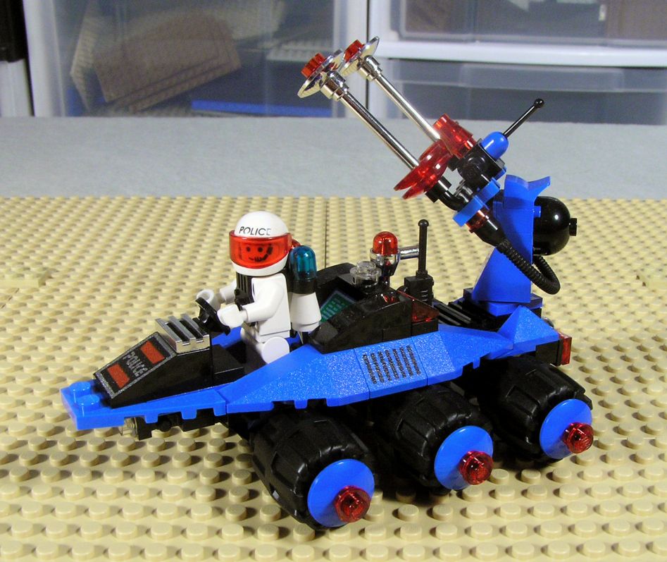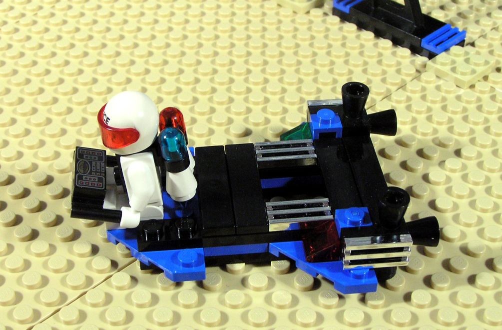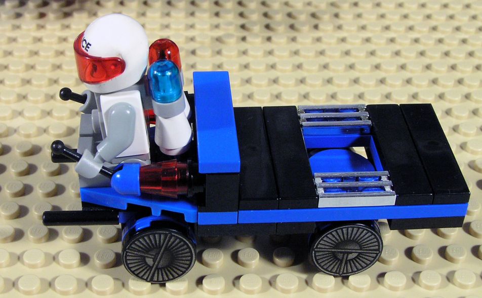 We begin with the Message Decoder. The small size made it easy to add extras like a third wheel set, a computer and some mini-fig accessories. I used Mark Pockster's brilliant chrome blaster design as the standard sidearm. It also inspired me to come up with the backpack design, with which all the officers are equipped.